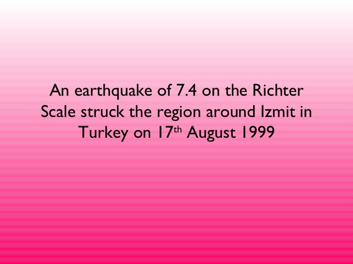 An earthquake of 74 on the richter scale struck the region around izmit in turkey on 17 th august 1999 2. Izmit earthquake facts 1. Thousands of people were killed and large parts of a number of mid sized towns and cities were destroyed.